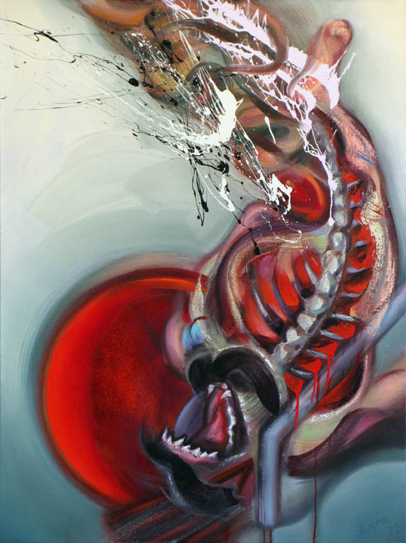 I completed this work yesterday. What a relief it was to finally let go! It was very intense to work on that piece. Why? The answer is simple and will address the main question I expect people will have while looking at the work. There is no story. Nothing outside what’s there on the canvas. The title “White Triptych” gives no clue. I painted it with no safety net. No narrative on which you can rest your mind and “stop looking”. I painted that triptych with the sole intent to make an image as intense as possible. This resulted in a very precarious painting process where nothing was ever definitely acquired. I painted a background and erased it the day after. A three-headed figure ended up with just one and a single-headed figure was finally decapitated, a bizarre necklace of teeth submerged by pouring blood in place of the wound. This same figure that was originally a woman was then gratified with a penis… So, lots of transformations that preoccupied me and that I can’t really explain. I don’t hold the key to the enigma. I just painted what excited me and what seemed to work. To paint that way, without the back-up of a storyline, even as subtle as it can be, one needs to be particularly confident. That’s why I’m very proud of that piece. And also because I like kicking people in the guts. I hope this satisfies a bit the urge a few of you already expressed for some kind of “explanation”. Still, I wish on no account to diminish the scope of that triptych. Yours truly. Mathieu
